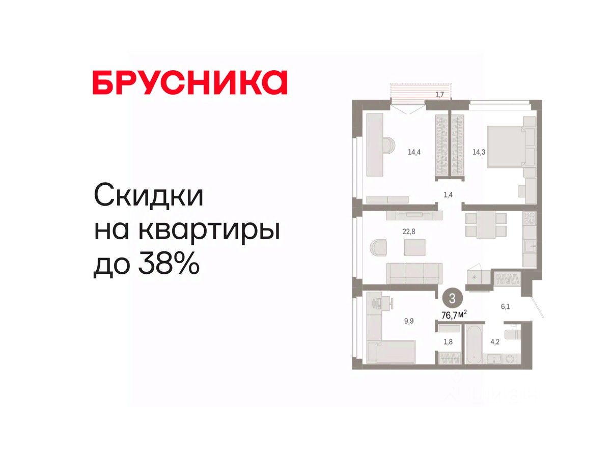 Трехкомнатная квартира с предчистовой отделкой в ЖК "Республики 205" на 9 этаже. Общая площадь: 76.65 кв.м. Высота потолков 2.7 м.