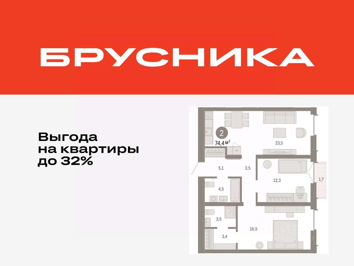 2-комн. квартира от застройщика с предчистовой отделкой в ЖК "Республики 205" на 8 этаже. Общая площадь: 74.43 кв.м., жилая: 29.2 кв.м., площадь просторной кухни-гостиной: 23.5 кв.м. Комнаты изолированные, все окна выходят на одну сторону. В квартире один балкон, два совмещенных санузла. Высота потолков 2.7 м.