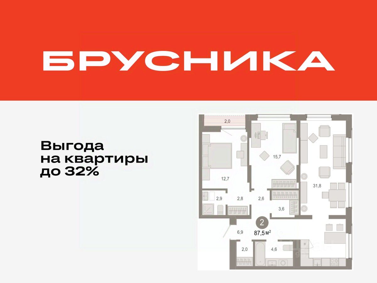 Квартира с кухней-гостиной и двумя спальнями в Октябрьском на Туре. Особенности планировки: гардеробная, вид во двор, лоджия, предчистовая отделка, мастер-спальня.