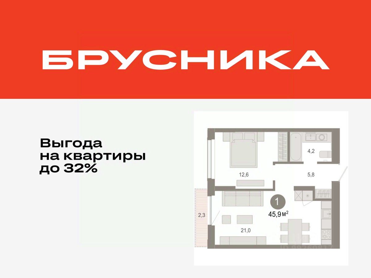 Квартира с кухней-гостиной и одной спальней в Октябрьском на Туре. Особенности планировки: предчистовая отделка, балкон.