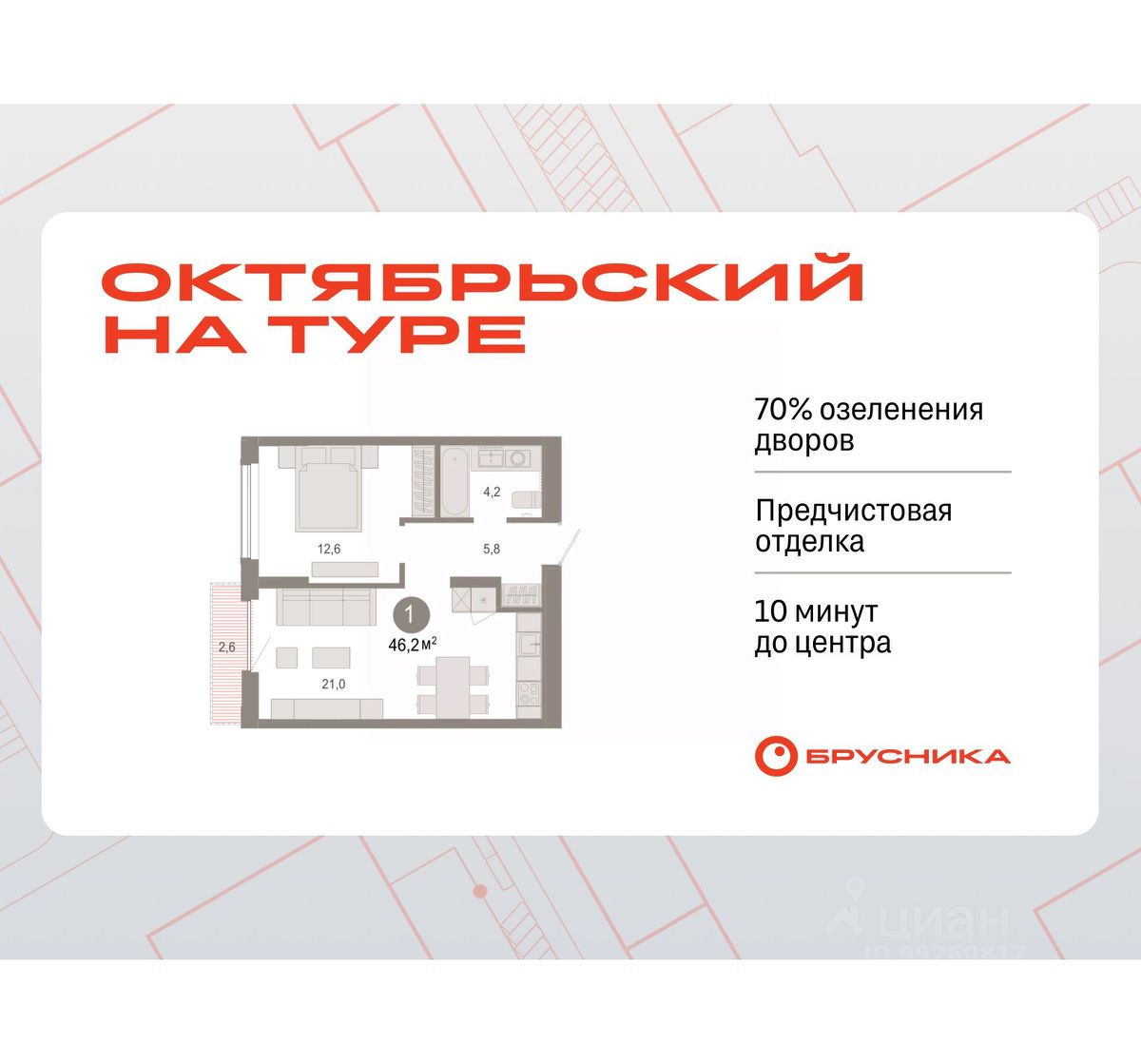 Квартира с кухней-гостиной и одной спальней в Октябрьском на Туре. Особенности планировки: предчистовая отделка, балкон.