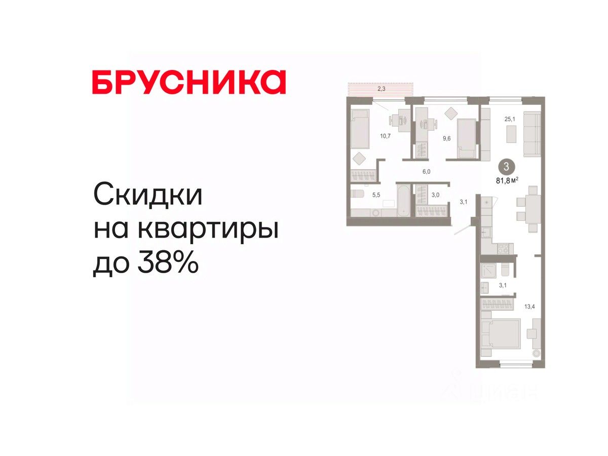 Квартира с кухней-гостиной и тремя спальнями в Октябрьском на Туре. Особенности планировки: гардеробная, вид во двор, разнесённые спальни, предчистовая отделка, мастер-спальня, балкон.