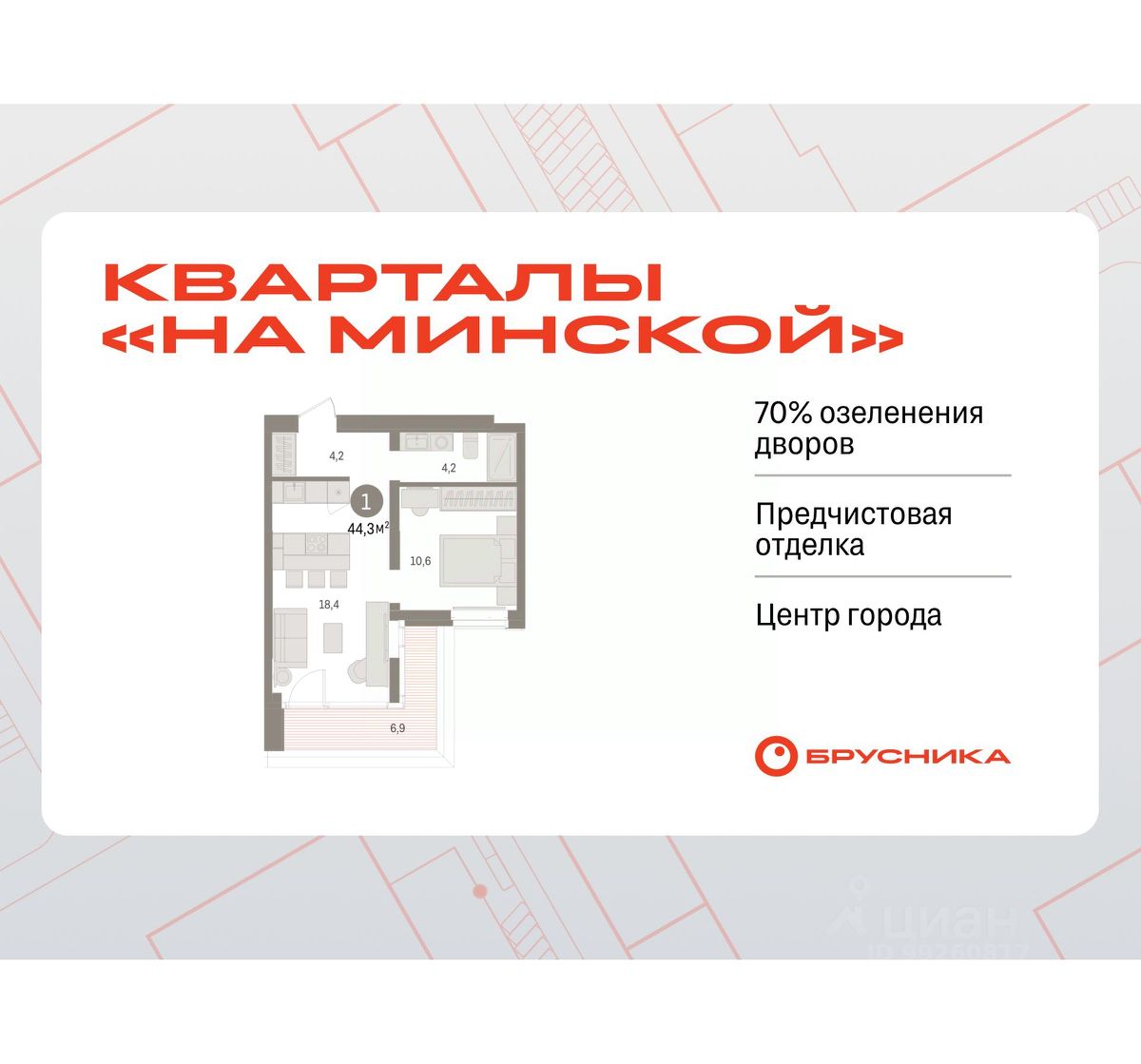 Квартира с кухней-гостиной и одной спальней в кварталах "На Минской". Особенности планировки: панорамное остекление, лоджия, предчистовая отделка.
