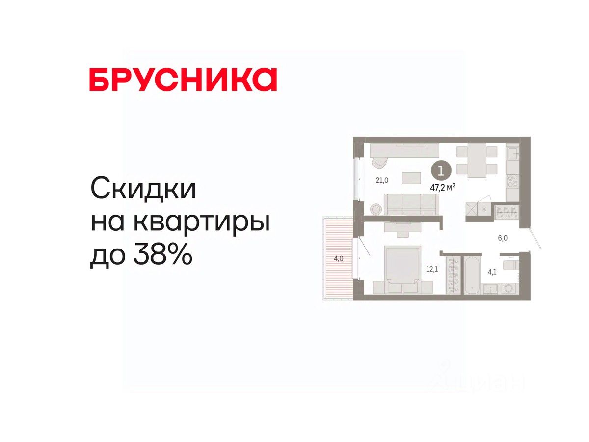 Квартира с кухней-гостиной и одной спальней в кварталах "На Минской". Особенности планировки: балкон, предчистовая отделка.