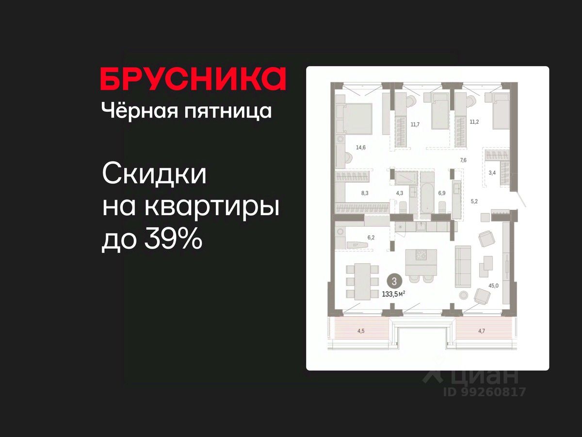 Квартира с кухней-гостиной и тремя спальнями в кварталах "На Минской". Особенности планировки: окна на две стороны, гардеробная, вид во двор, предчистовая отделка, мастер-спальня, терраса на крыше.