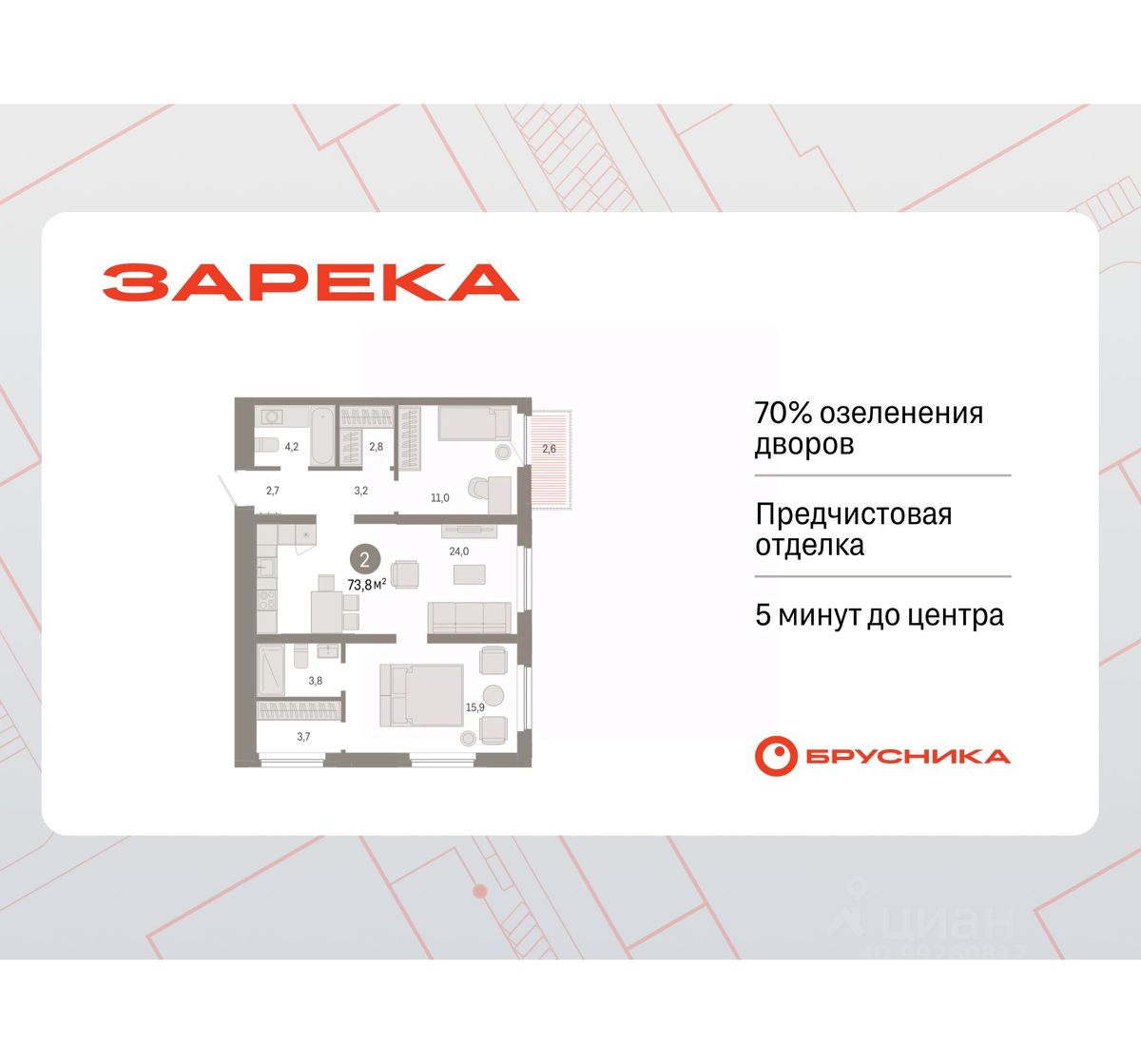 Двухкомнатная квартира с предчистовой отделкой в ЖК "Зарека" на 11 этаже. Общая площадь: 73.78 кв.м., жилая: 26.9 кв.м., площадь просторной кухни-гостиной: 24 кв.м. Квартира угловая, идеально подойдет любителям тишины и панорамных видов. В квартире один балкон, два совмещенных санузла. Высота потолков 2.7 м.