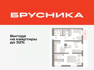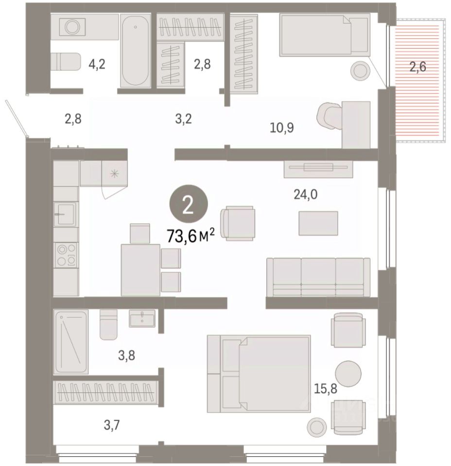 Квартира с кухней-гостиной и двумя спальнями в жилом районе "Зарека". Особенности планировки: гардеробная, разнесённые спальни, предчистовая отделка, мастер-спальня, балкон.