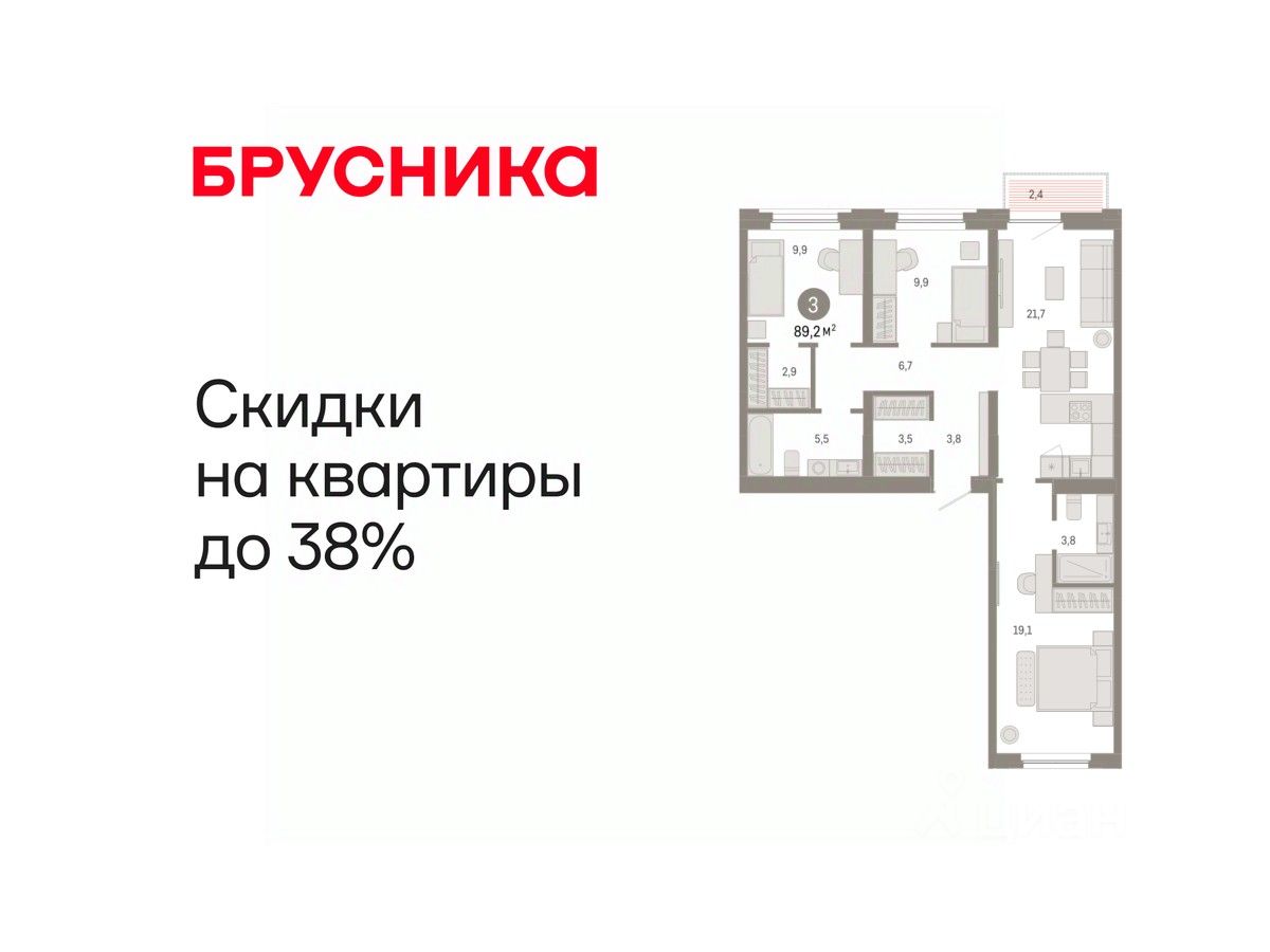 Продается 3-комн. квартира с предчистовой отделкой в ЖК "Зарека" на 6 этаже. Общая площадь: 89.23 кв.м., жилая: 38.9 кв.м., площадь просторной кухни-гостиной: 21.7 кв.м. Квартира - распашонка, без проходных комнат, окна выходят на paзные стороны дома. В квартире один балкон, два совмещенных санузла. Высота потолков 2.7 м.