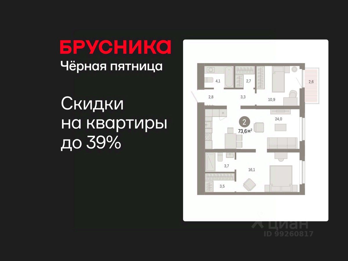 Квартира с кухней-гостиной и двумя спальнями в жилом районе "Зарека". Особенности планировки: гардеробная, разнесённые спальни, предчистовая отделка, мастер-спальня, балкон.