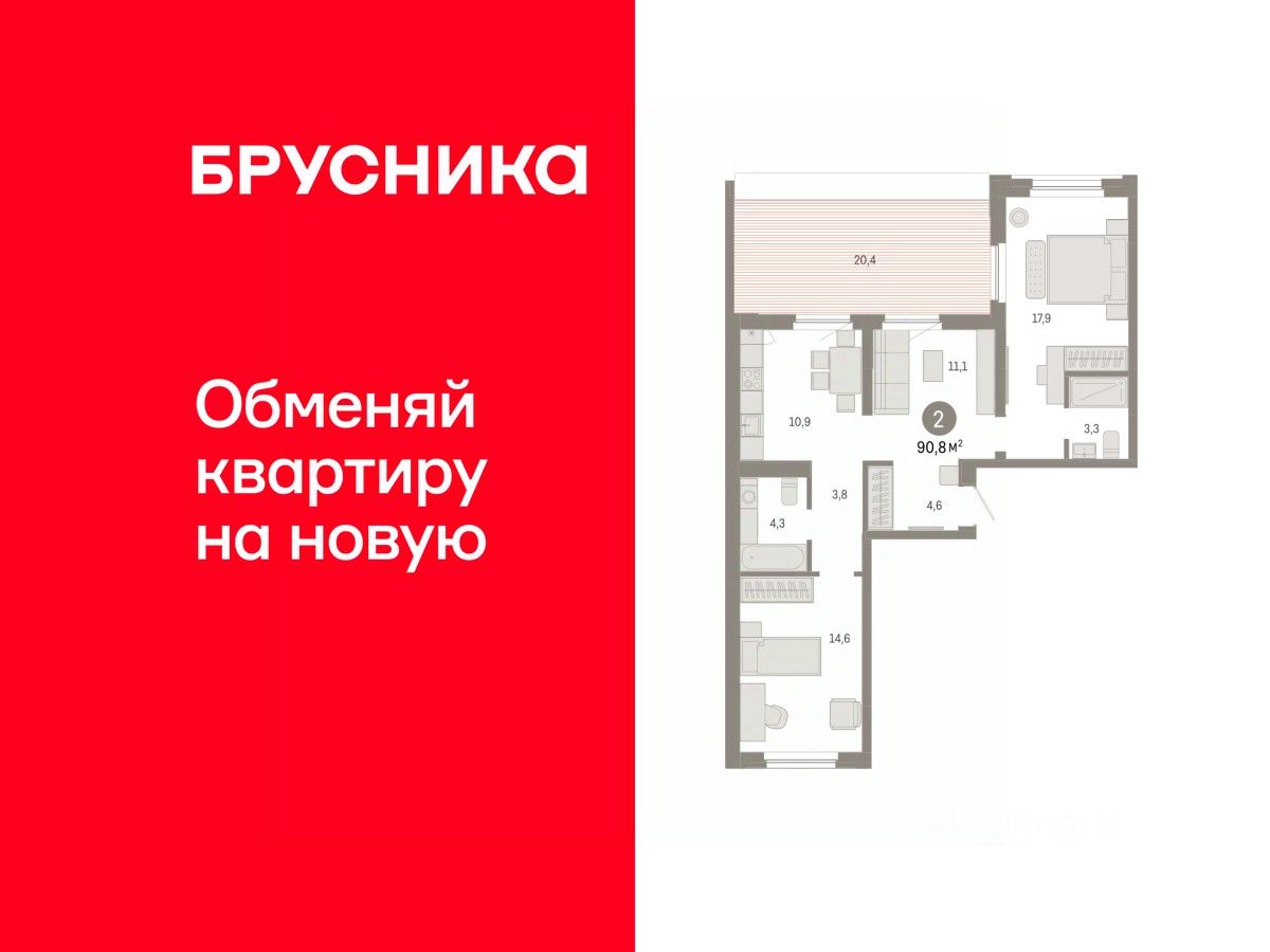 Квартира с кухней-гостиной и двумя спальнями в жилом районе "Зарека". Особенности планировки: предчистовая отделка, разнесённые спальни, терраса на крыше.