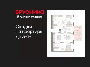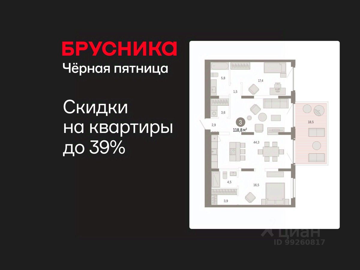 Квартира с кухней-гостиной и тремя спальнями в жилом районе "Зарека". Особенности планировки: гардеробная, без отделки, свободная планировка, разнесённые спальни, мастер-спальня, терраса.