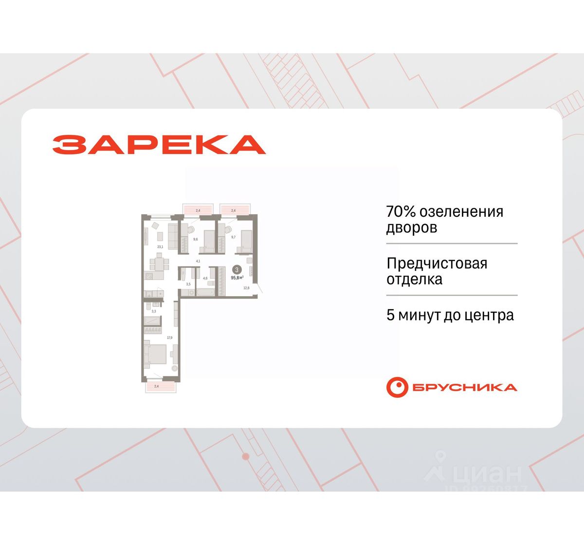 Трехкомнатная квартира с предчистовой отделкой в ЖК "Зарека" на 3 этаже. Общая площадь: 95.83 кв.м., жилая: 37.2 кв.м., площадь просторной кухни-гостиной: 23.1 кв.м. Квартира - распашонка, без проходных комнат, окна выходят на paзные стороны дома. В квартире три балкона, два совмещенных санузла. Высота потолков 2.7 м.