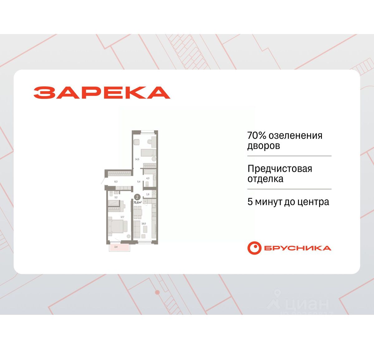 2-комн. квартира с предчистовой отделкой в ЖК "Зарека" на 2 этаже. Общая площадь: 75.58 кв.м. Высота потолков 2.7 м.