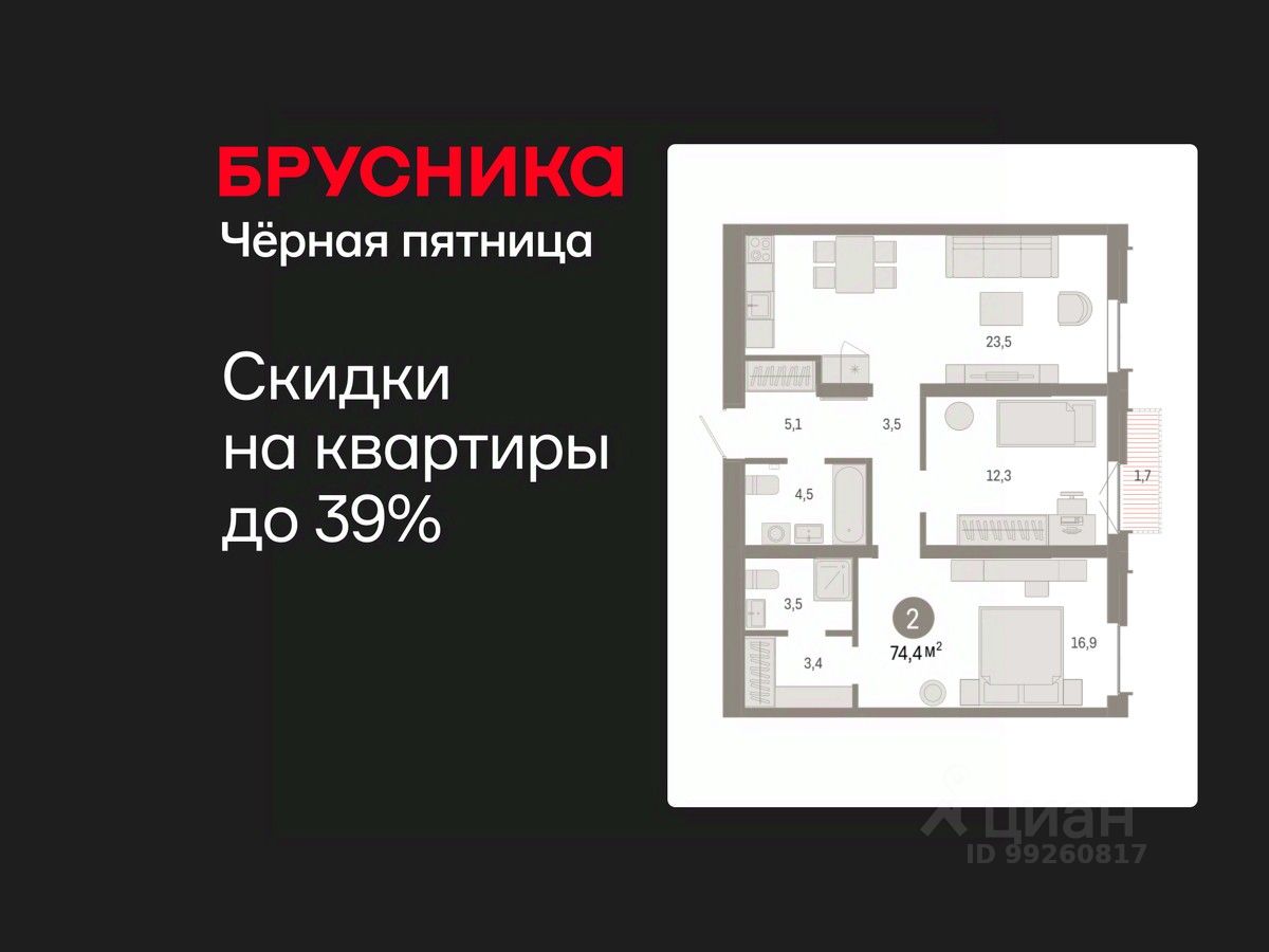 Продается двухкомнатная квартира от застройщика с предчистовой отделкой в ЖК "Республики 205" на 7 этаже. Общая площадь: 74.43 кв.м., жилая: 29.2 кв.м., площадь просторной кухни-гостиной: 23.5 кв.м. Комнаты изолированные, все окна выходят на одну сторону. В квартире один балкон, два совмещенных санузла. Высота потолков 2.7 м.