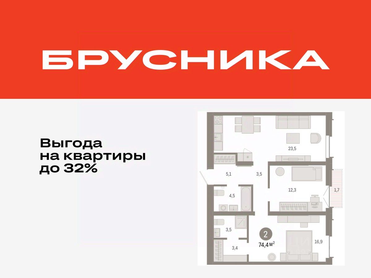 2-комн. квартира с предчистовой отделкой в ЖК "Республики 205" на 9 этаже. Общая площадь: 74.43 кв.м., жилая: 29.2 кв.м., площадь просторной кухни-гостиной: 23.5 кв.м. Комнаты изолированные, все окна выходят на одну сторону. В квартире один балкон, два совмещенных санузла. Высота потолков 2.7 м.