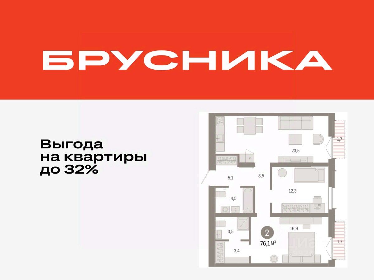 2-комн. квартира с предчистовой отделкой в ЖК "Республики 205" на 9 этаже. Общая площадь: 76.11 кв.м., жилая: 29.2 кв.м., площадь просторной кухни-гостиной: 23.5 кв.м. Комнаты изолированные, все окна выходят на одну сторону. В квартире два балкона, два совмещенных санузла. Высота потолков 2.7 м.