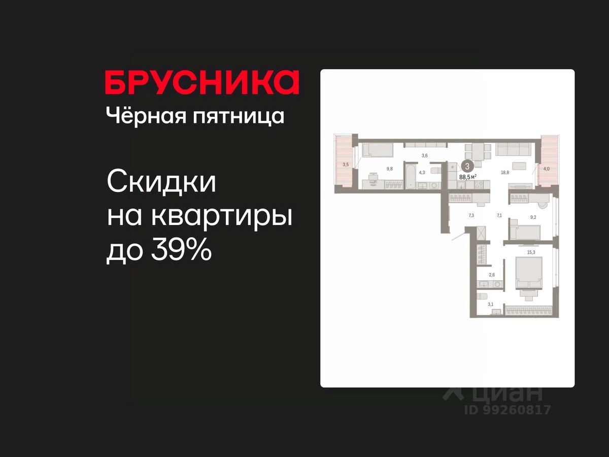 3-комн. квартира с предчистовой отделкой в ЖК "Республики 205" на 9 этаже. Общая площадь: 88.48 кв.м. Высота потолков 2.7 м.