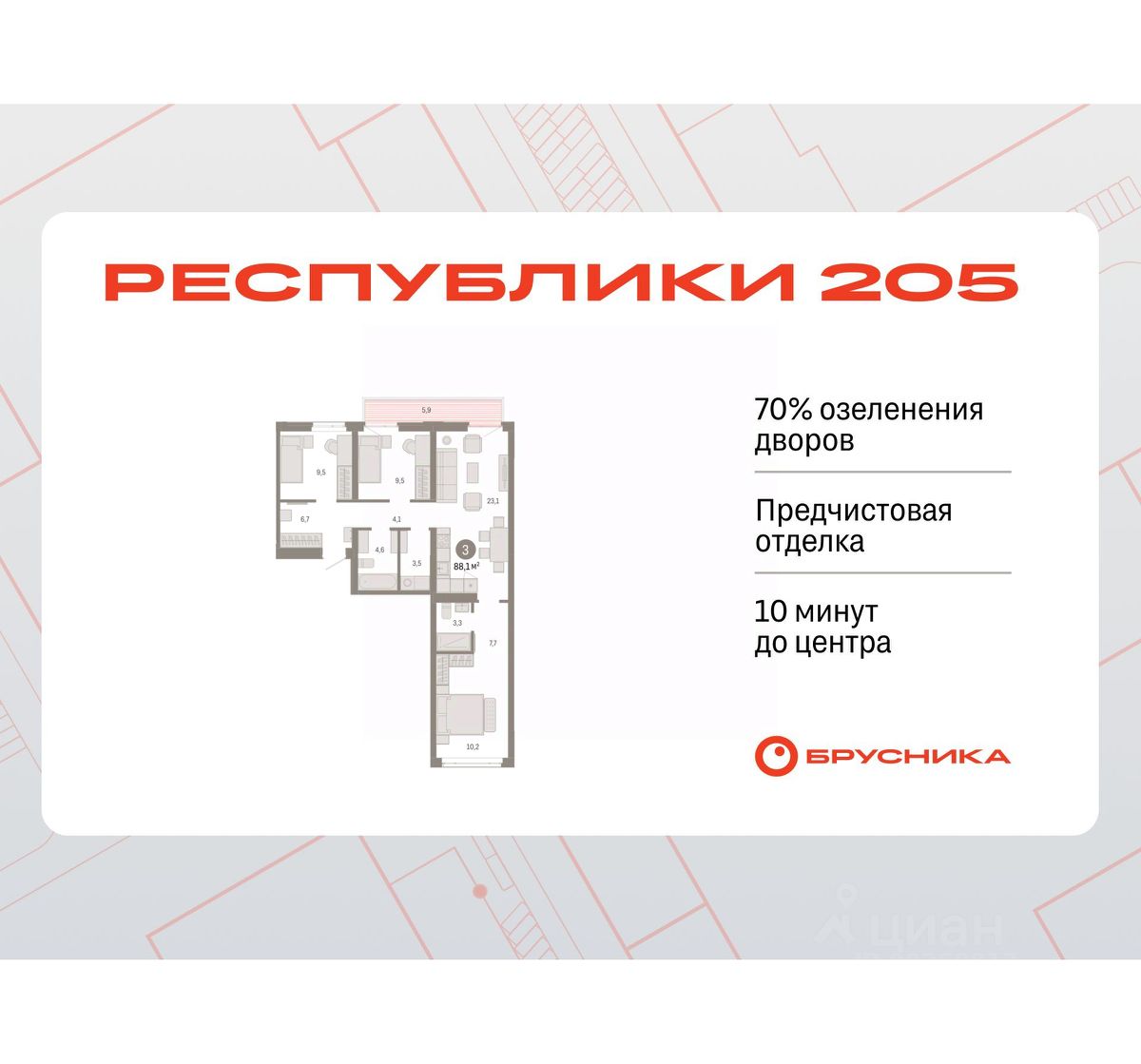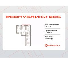 3-комн. квартира с предчистовой отделкой в ЖК "Республики 205" на 7 этаже. Общая площадь: 88.09 кв.м., жилая: 29.2 кв.м., площадь просторной кухни-гостиной: 23.1 кв.м. Квартира - распашонка, без проходных комнат, окна выходят на paзные стороны дома. В квартире один балкон, два совмещенных санузла. Высота потолков 2.7 м.