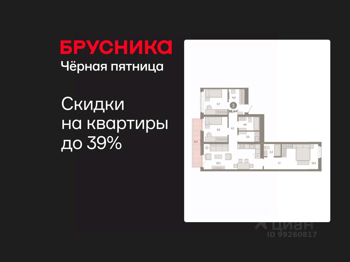 3-комн. квартира с предчистовой отделкой в ЖК "Республики 205" на 4 этаже. Общая площадь: 88.44 кв.м., жилая: 29.4 кв.м., площадь просторной кухни-гостиной: 23.1 кв.м. Квартира - распашонка, без проходных комнат, окна выходят на paзные стороны дома. В квартире два балкона, два совмещенных санузла. Высота потолков 2.7 м.