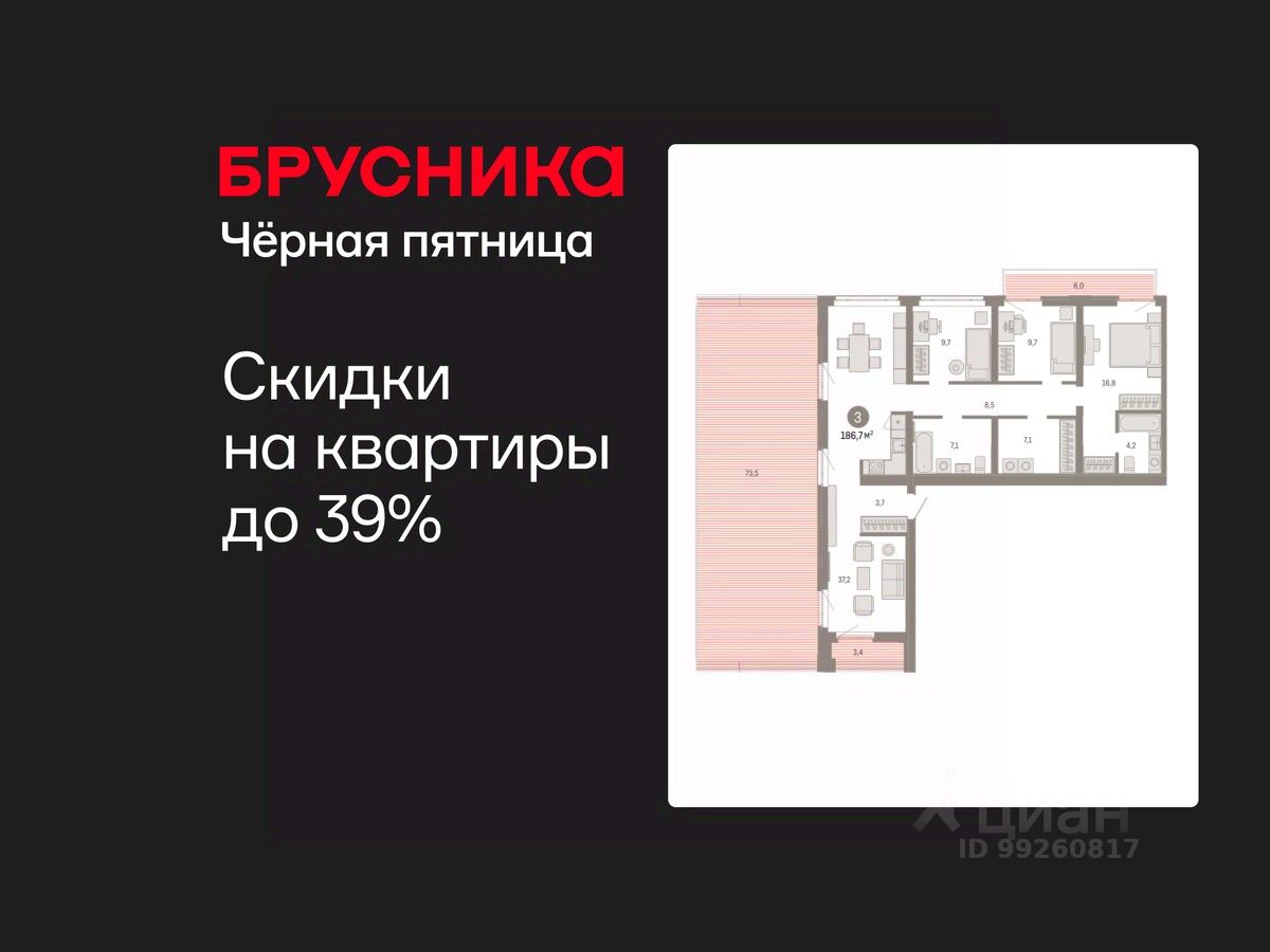 Просторная трехкомнатная квартира с предчистовой отделкой в ЖК "Республики 205" на 3 этаже. Общая площадь: 186.65 кв.м. Высота потолков 2.7 м.