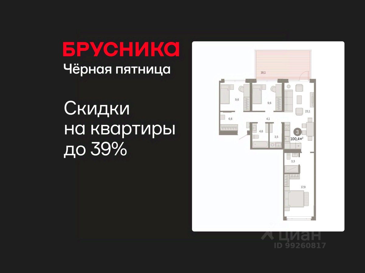 3-комн. квартира с предчистовой отделкой в ЖК "Республики 205" на 2 этаже. Общая площадь: 100.44 кв.м. Высота потолков 2.7 м.