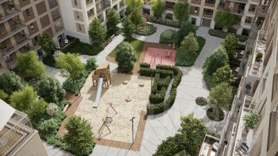 Пешеходные бульвары внутри района соединят между собой улицу ресторанов, детские и спортивные площадки, событийную площадь и летний кинотеатр.