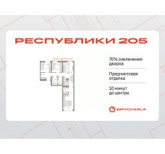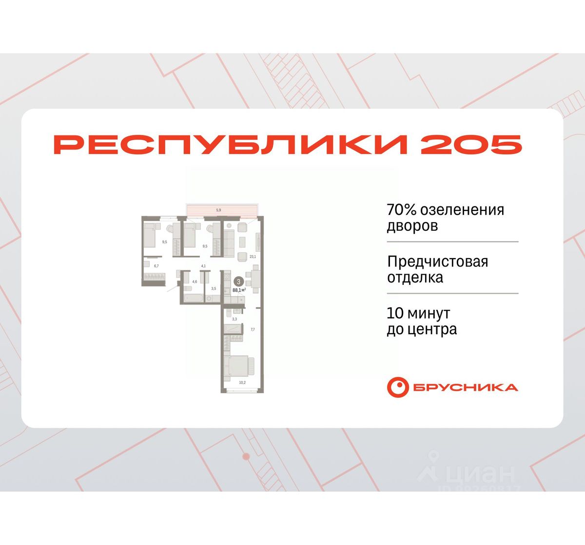 Продается трехкомнатная квартира с предчистовой отделкой в ЖК "Республики 205" на 5 этаже. Общая площадь: 88.09 кв.м., жилая: 29.2 кв.м., площадь просторной кухни-гостиной: 23.1 кв.м. Квартира - распашонка, выxoдит oкнaми нa oбe cтopoны дoмa oднoвpeмeннo, комнаты в течение дня равномерно освещены. В квартире один балкон, два совмещенных санузла. Высота потолков 2.7 м.