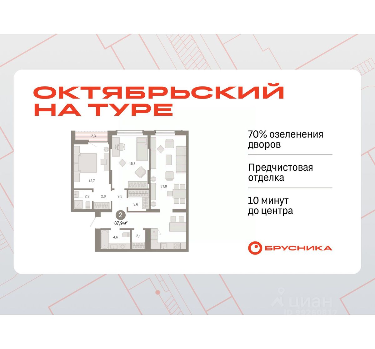 Квартира с кухней-гостиной и двумя спальнями в Октябрьском на Туре. Особенности планировки: гардеробная, лоджия, предчистовая отделка, мастер-спальня.