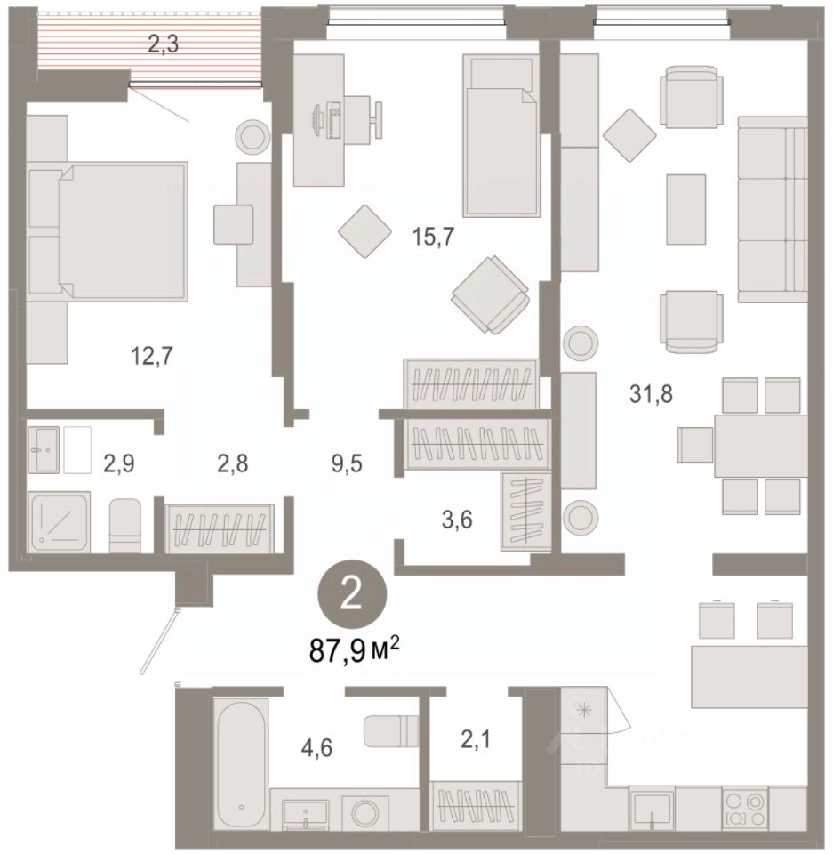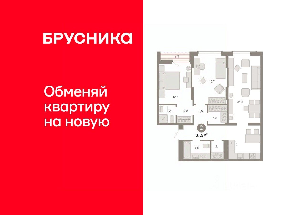 Квартира с кухней-гостиной и двумя спальнями в Октябрьском на Туре. Особенности планировки: гардеробная, лоджия, мастер-спальня, предчистовая отделка.