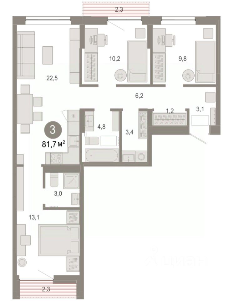 Квартира с кухней-гостиной и тремя спальнями в Октябрьском на Туре. Особенности планировки: балкон, вид во двор, гардеробная, лоджия, мастер-спальня, постирочная, предчистовая отделка, разнесённые спальни.