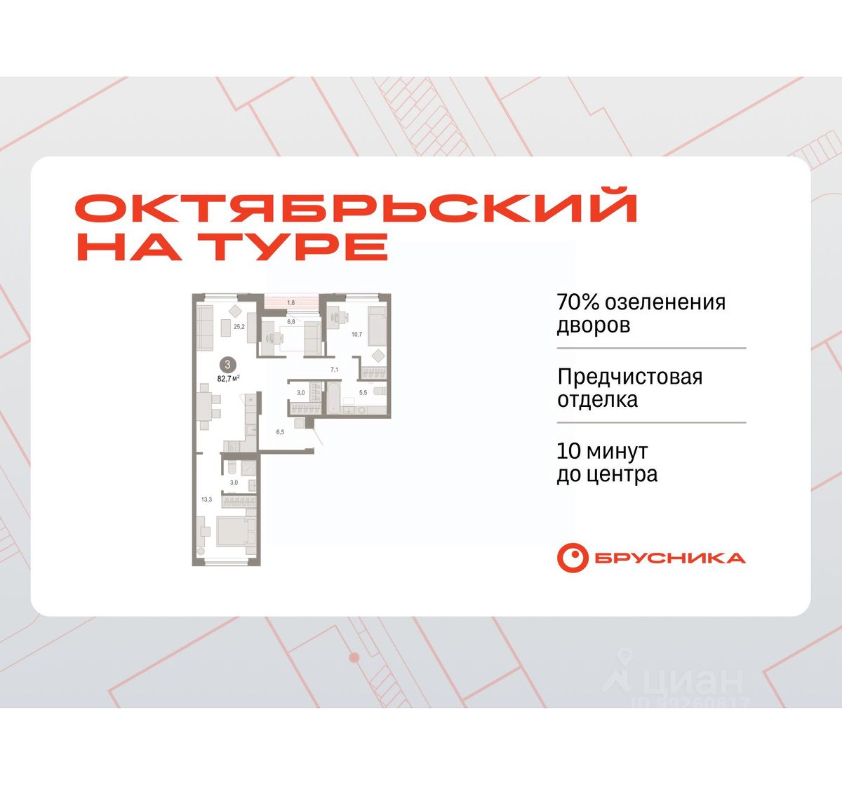 Квартира с кухней-гостиной и тремя спальнями в Октябрьском на Туре. Особенности планировки: гардеробная, вид во двор, лоджия, разнесённые спальни, предчистовая отделка, мастер-спальня.