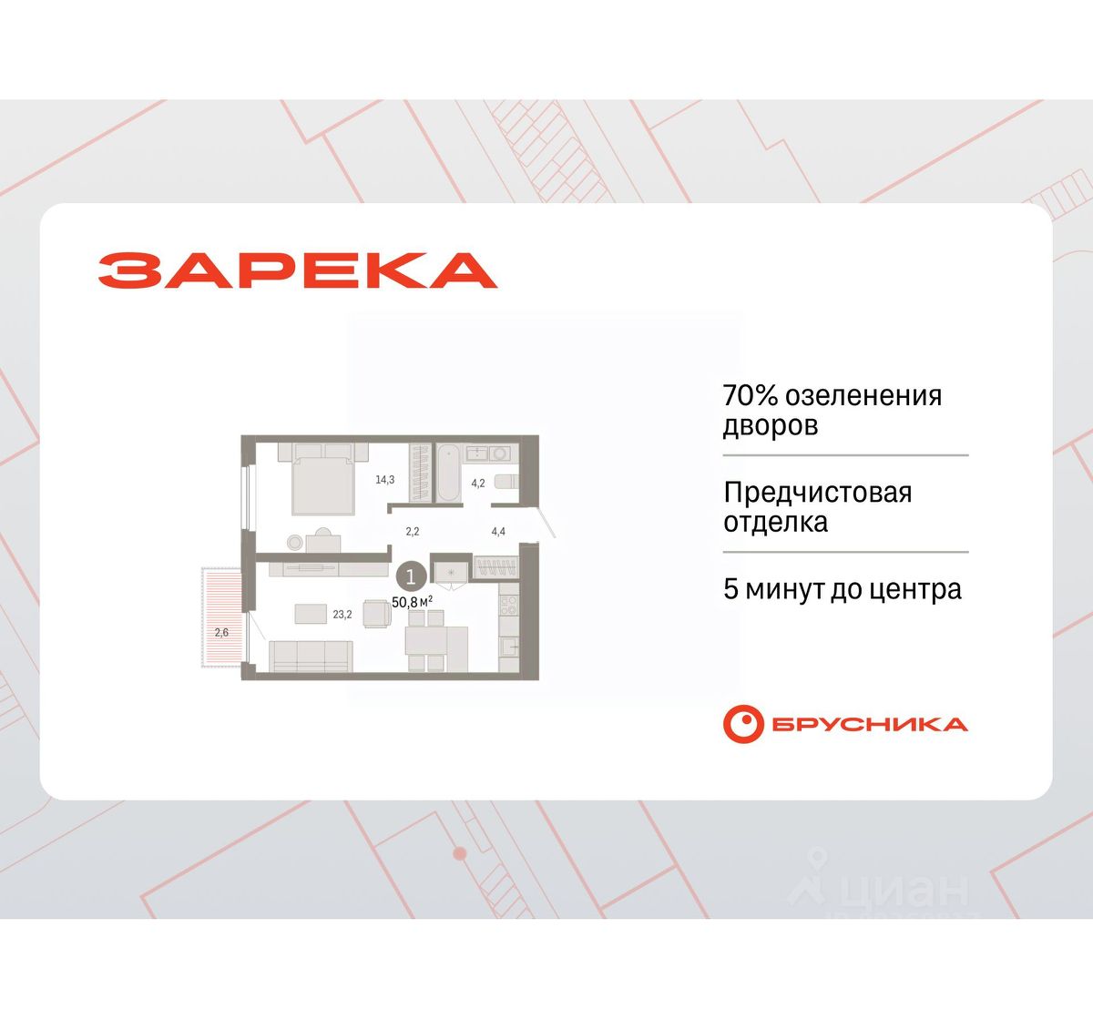 Продается однокомнатная квартира с предчистовой отделкой в ЖК "Зарека" на 11 этаже. Общая площадь: 50.75 кв.м., жилая: 14.3 кв.м., площадь просторной кухни-гостиной: 23.2 кв.м. Все окна выходят на одну сторону. В квартире один балкон, один совмещенный санузел. Высота потолков 2.7 м.