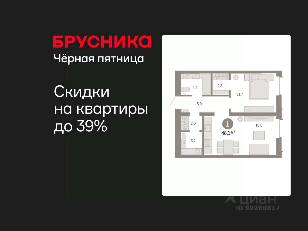 Однокомнатная квартира от застройщика с предчистовой отделкой в ЖК "Республики 205" на 14 этаже. Общая площадь: 48.06 кв.м., жилая: 11.7 кв.м., площадь просторной кухни-гостиной: 18.6 кв.м. Все окна выходят на одну сторону. В квартире один совмещенный санузел. Высота потолков 2.7 м.