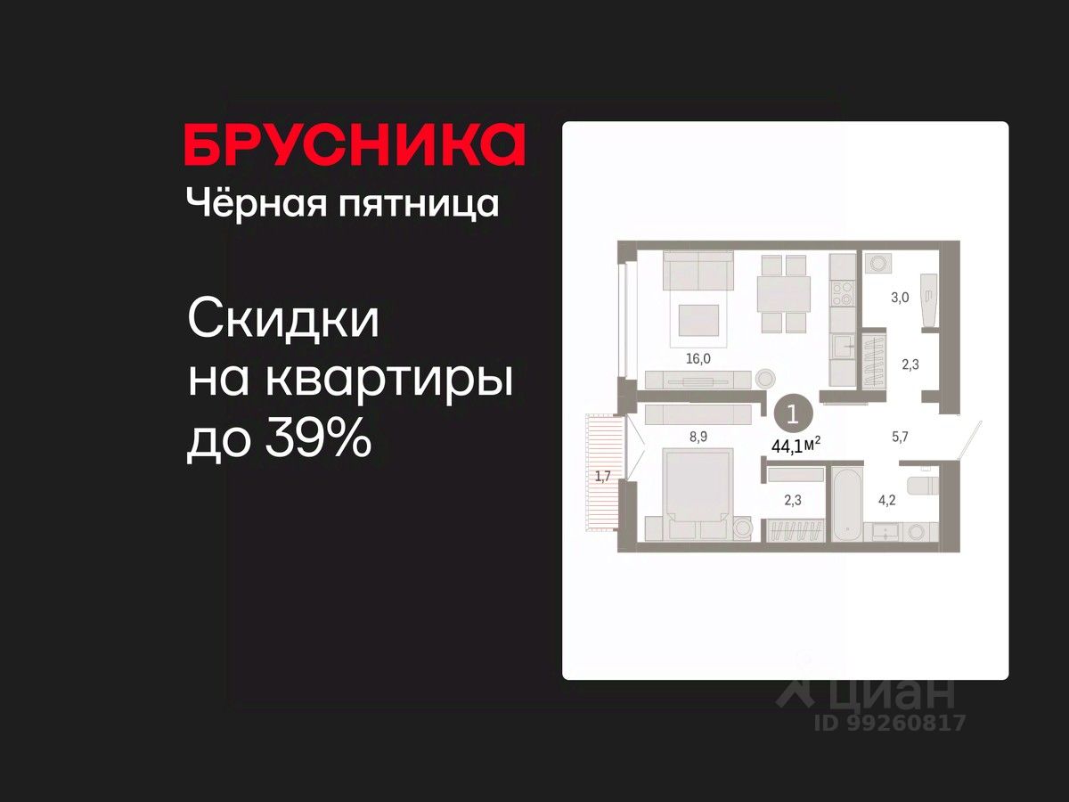 1-комн. квартира от застройщика с предчистовой отделкой в ЖК "Республики 205" на 9 этаже. Общая площадь: 44.1 кв.м., жилая: 8.9 кв.м., площадь просторной кухни-гостиной: 16 кв.м. Все окна выходят на одну сторону. В квартире один балкон, один совмещенный санузел. Высота потолков 2.7 м.