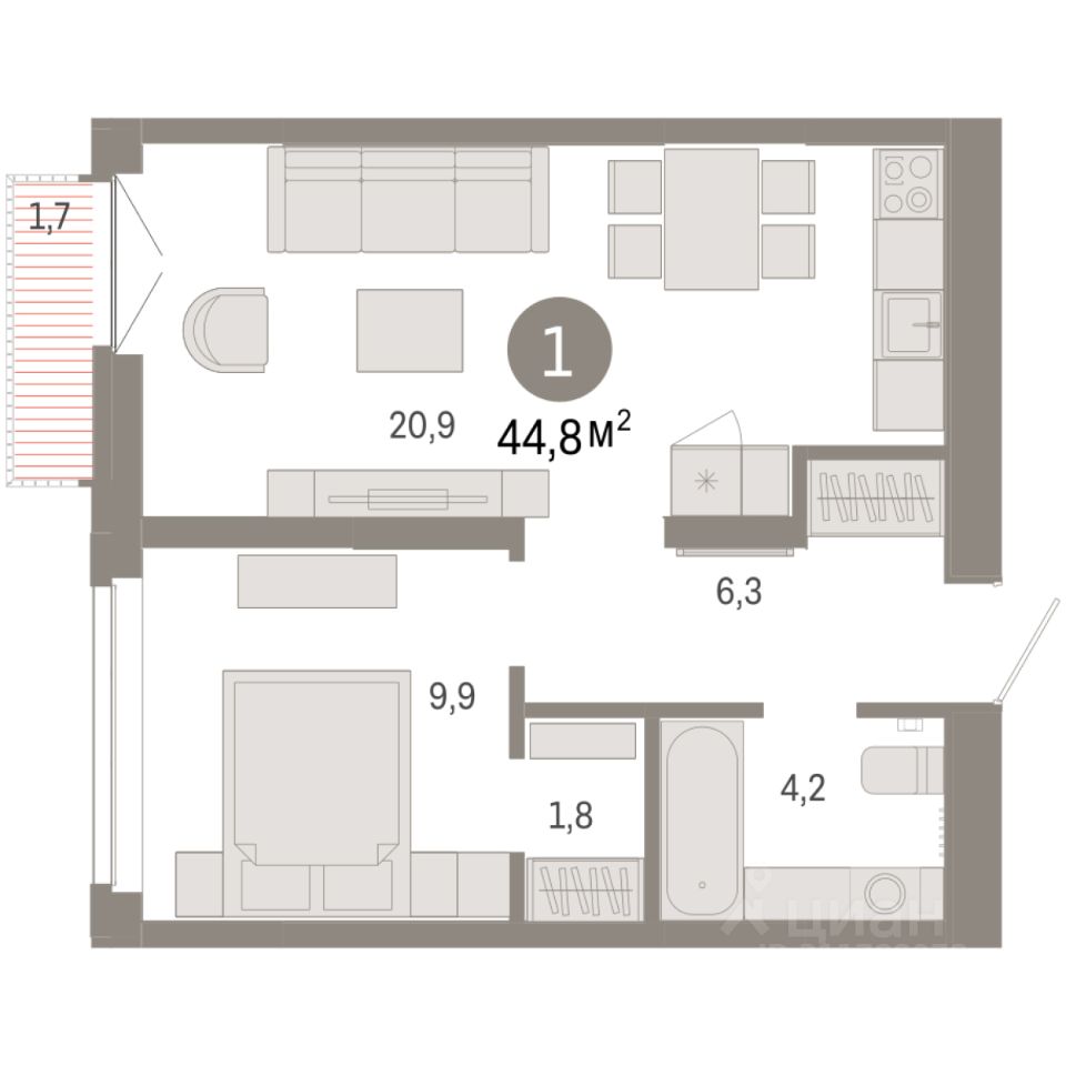 Продается однокомнатная квартира с предчистовой отделкой в ЖК "Республики 205" на 7 этаже. Общая площадь: 44.84 кв.м., жилая: 9.9 кв.м., площадь просторной кухни-гостиной: 20.9 кв.м. Все окна выходят на одну сторону. В квартире один балкон, один совмещенный санузел. Высота потолков 2.7 м.
