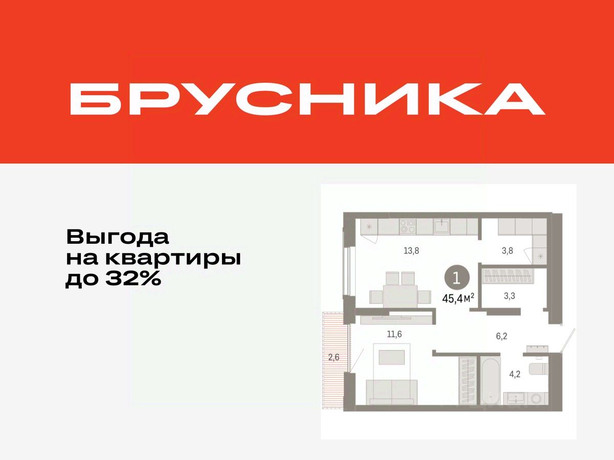 Квартира с кухней-гостиной и одной спальней в Октябрьском на Туре. Особенности планировки: предчистовая отделка, балкон.