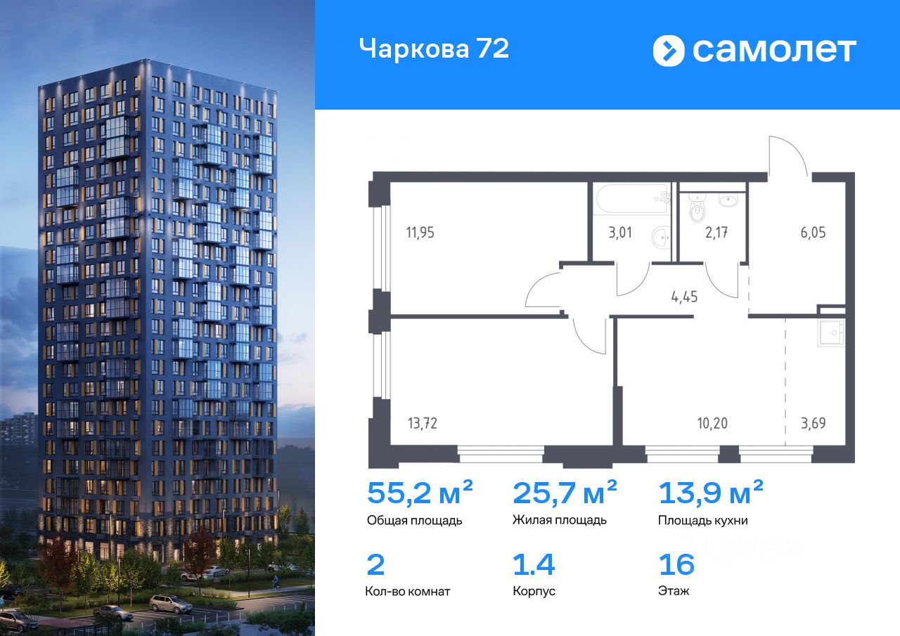 Предлагается 2-комнатная квартира комфорт-класса 55,24 кв.м в корпусе 1.4 на 16 этаже, в ЖК "Чаркова 72"