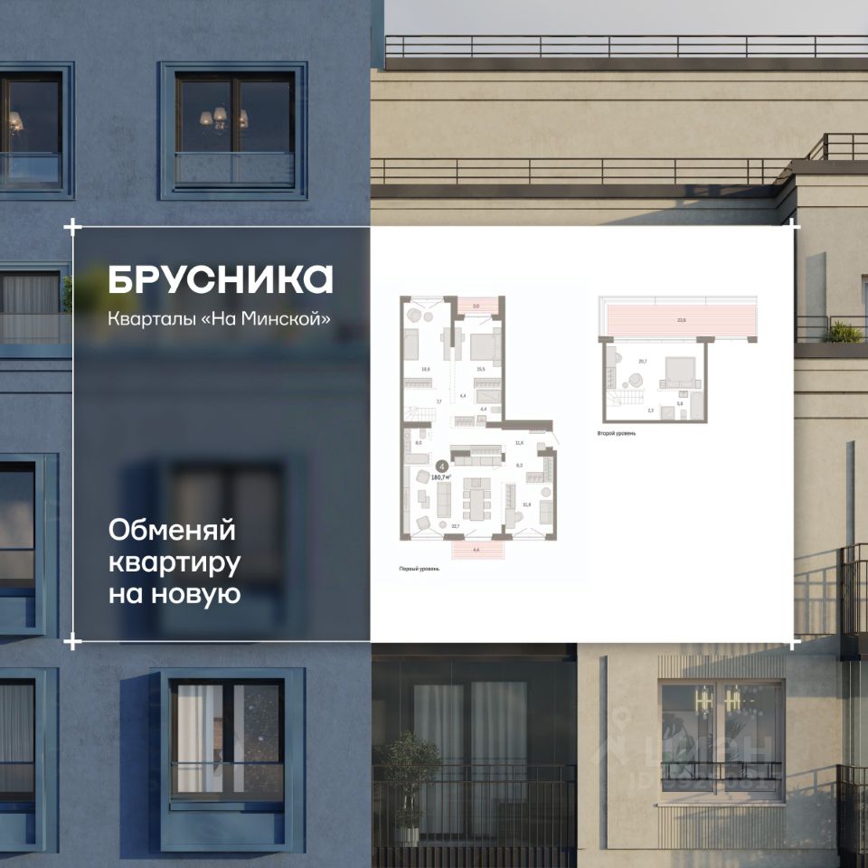 Двухуровневая квартира с кухней-гостиной и четырьмя спальнями в кварталах "На Минской". Особенности планировки: балкон, вид во двор, второй санузел, двухуровневая, окна на две стороны, потолки 3 м и выше, предчистовая отделка, рабочий кабинет, разнесённые спальни, терраса на крыше, тёплая лоджия.