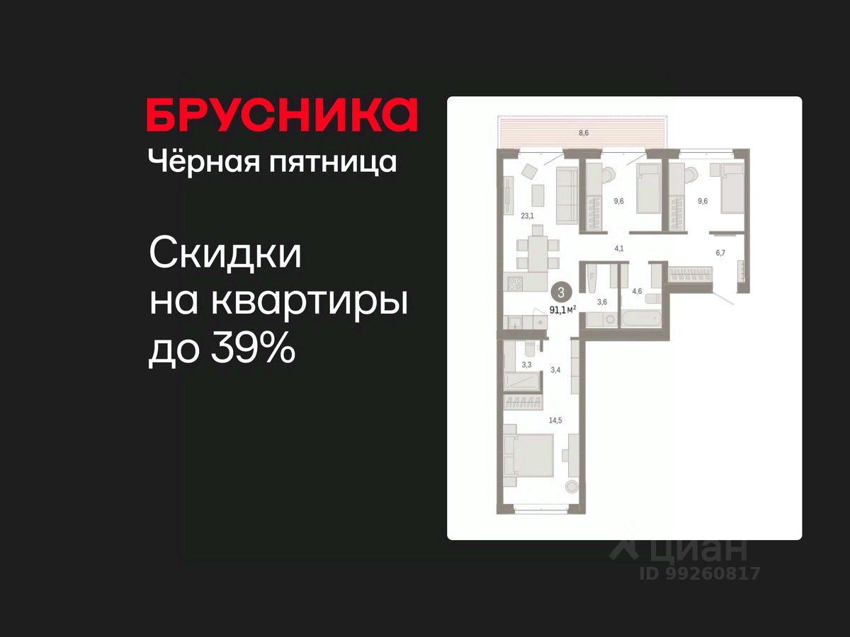 3-комн. квартира с предчистовой отделкой в Кварталы "На Минской" на 6 этаже. Общая площадь: 91.05 кв.м. Высота потолков 2.7 м.