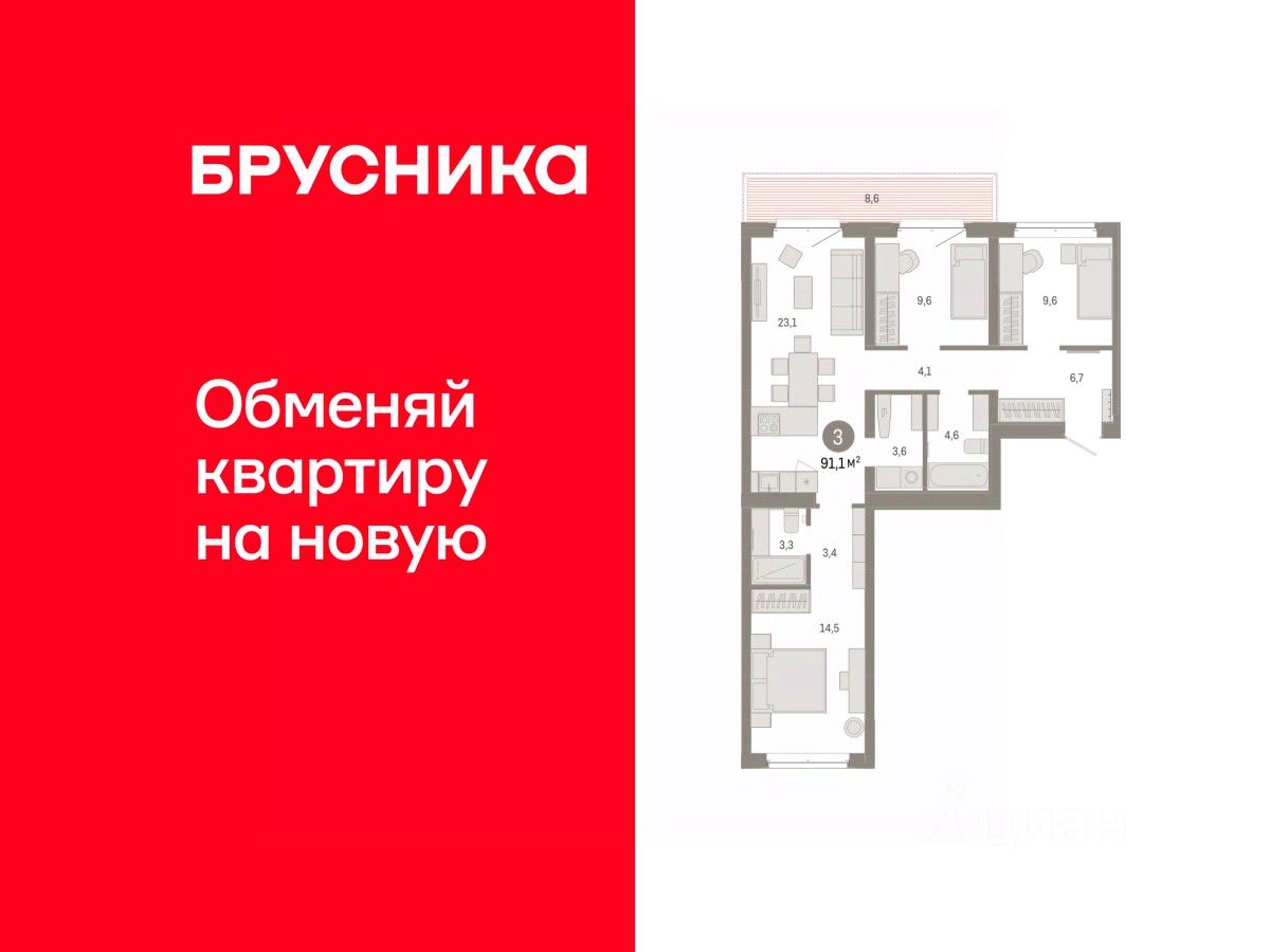 Квартира с кухней-гостиной и тремя спальнями в кварталах "На Минской". Особенности планировки: балкон, окна на две стороны, предчистовая отделка, разнесённые спальни.