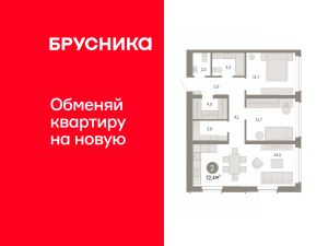2-комн. квартира с предчистовой отделкой в ЖК "Республики 205" на 11 этаже. Общая площадь: 72.39 кв.м., жилая: 23.4 кв.м., площадь просторной кухни-гостиной: 24.5 кв.м. Квартира угловая, очень светлая, естественная вентиляция при открытии окон. В квартире один совмещенный и один раздельный санузел. Высота потолков 2.7 м.