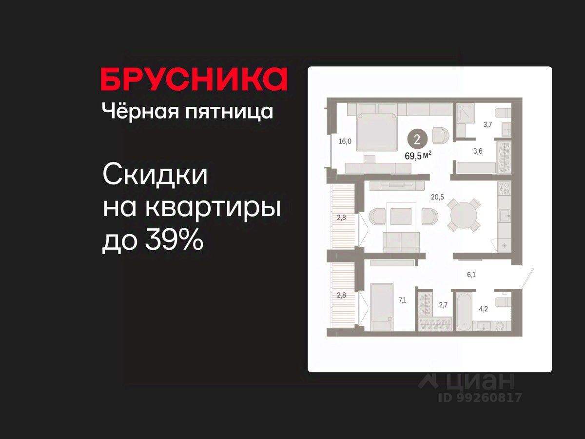 Просторная 2-комн. квартира с предчистовой отделкой в ЖК "Республики 205" на 4 этаже. Общая площадь: 69.47 кв.м., жилая: 23.1 кв.м., площадь просторной кухни-гостиной: 20.5 кв.м. Комнаты изолированные, все окна выходят на одну сторону. В квартире две лоджии, два совмещенных санузла. Высота потолков 2.7 м.