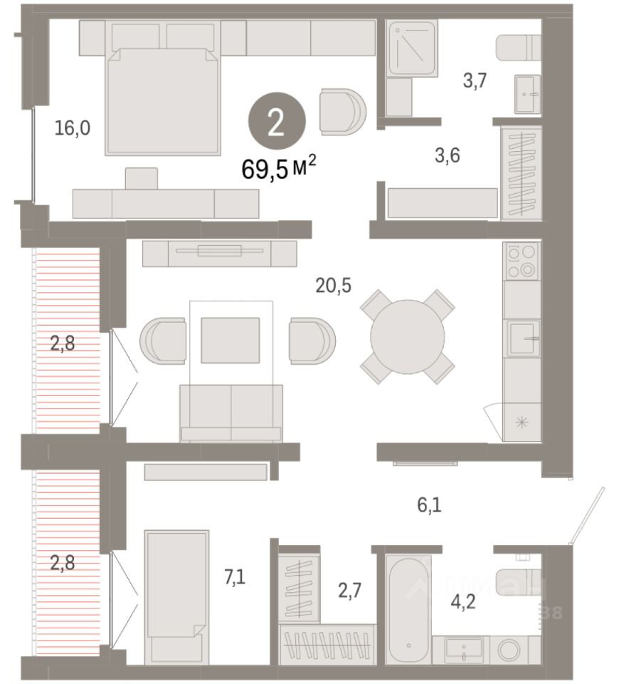 2-комн. квартира от застройщика с предчистовой отделкой в ЖК "Республики 205" на 6 этаже. Общая площадь: 69.53 кв.м. Высота потолков 2.7 м.