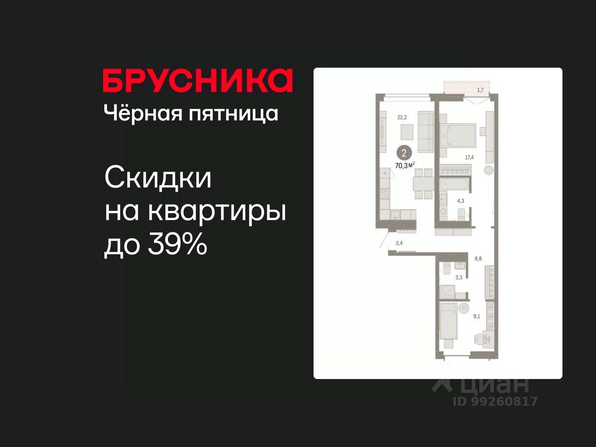 2-комн. квартира с предчистовой отделкой в ЖК "Республики 205" на 7 этаже. Общая площадь: 70.26 кв.м. Высота потолков 2.7 м.