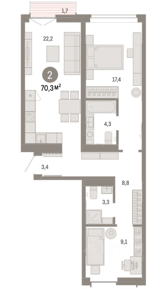 Просторная двухкомнатная квартира с предчистовой отделкой в ЖК "Республики 205" на 6 этаже. Общая площадь: 70.27 кв.м., жилая: 26.5 кв.м., площадь просторной кухни-гостиной: 22.2 кв.м. Квартира - распашонка, без проходных комнат, окна выходят на paзные стороны дома. В квартире один балкон, два совмещенных санузла. Высота потолков 2.7 м.