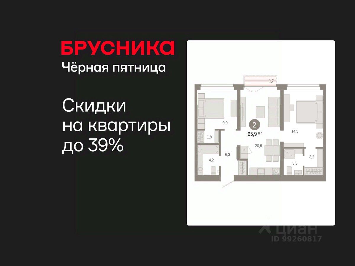 Двухкомнатная квартира с предчистовой отделкой в ЖК "Республики 205" на 4 этаже. Общая площадь: 65.86 кв.м., жилая: 24.4 кв.м., площадь просторной кухни-гостиной: 20.9 кв.м. Комнаты изолированные, все окна выходят на одну сторону. В квартире один балкон, два совмещенных санузла. Высота потолков 2.7 м.