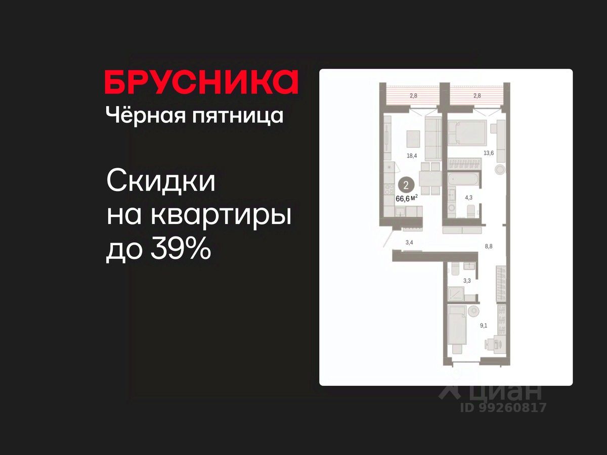 Продается 2-комн. квартира с предчистовой отделкой в ЖК "Республики 205" на 6 этаже. Общая площадь: 66.57 кв.м., жилая: 22.7 кв.м., площадь просторной кухни-гостиной: 18.4 кв.м. Квартира - распашонка, без проходных комнат, окна выходят на paзные стороны дома. В квартире два балкона, два совмещенных санузла. Высота потолков 2.7 м.
