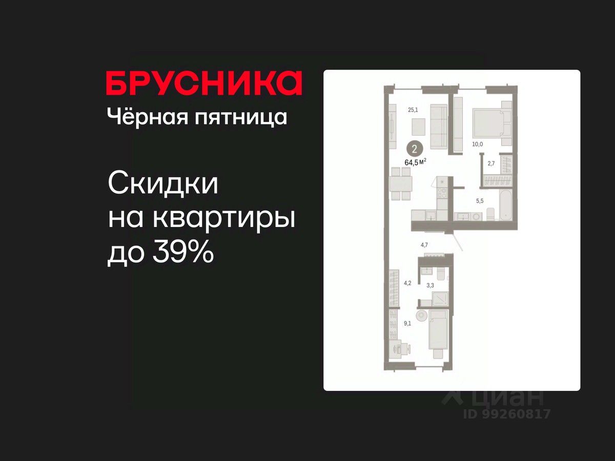 Просторная 2-комн. квартира с предчистовой отделкой в ЖК "Республики 205" на 4 этаже. Общая площадь: 64.46 кв.м., жилая: 19.1 кв.м., площадь просторной кухни-гостиной: 25.1 кв.м. Квартира - распашонка, без проходных комнат, окна выходят на paзные стороны дома. В квартире два совмещенных санузла. Высота потолков 2.7 м.