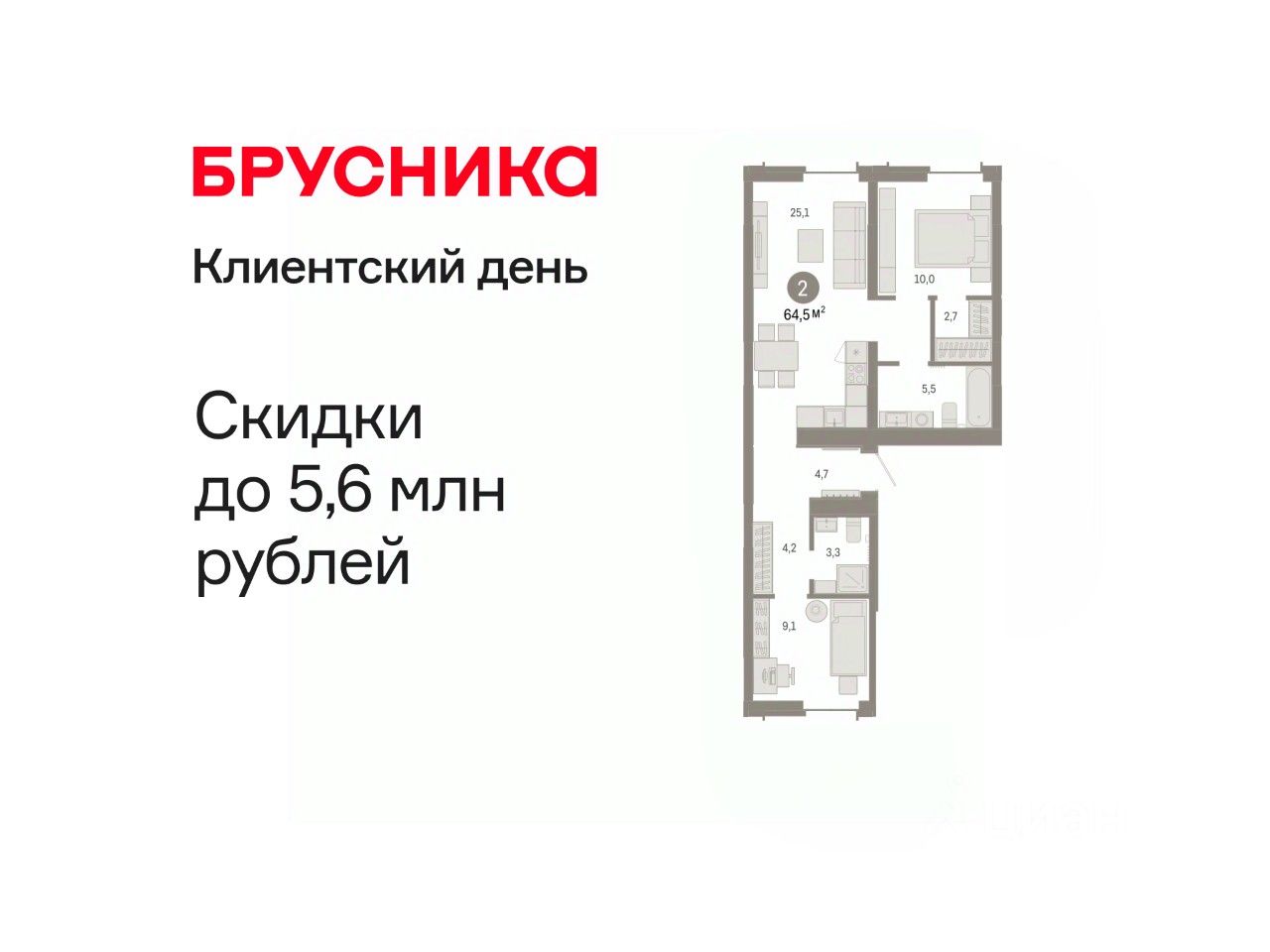 Продается 2-комн. квартира с предчистовой отделкой в ЖК "Республики 205" на 5 этаже. Общая площадь: 64.46 кв.м., жилая: 19.1 кв.м., площадь просторной кухни-гостиной: 25.1 кв.м. Квартира - распашонка, без проходных комнат, окна выходят на paзные стороны дома. В квартире два совмещенных санузла. Высота потолков 2.7 м.