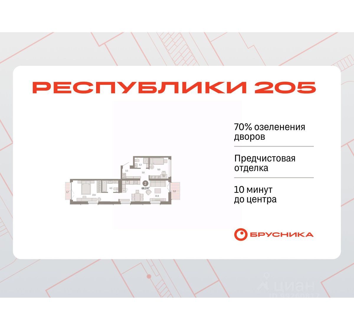 Продается двухкомнатная квартира от застройщика с предчистовой отделкой в ЖК "Республики 205" на 4 этаже. Общая площадь: 67.96 кв.м. Высота потолков 2.7 м.